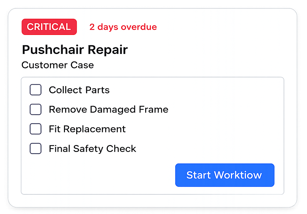 The Workspace manages Service Records in real time. Active work is visible. Tasklists are predefined. SLA timers run automatically. Estimates require approval before continuation. Status updates follow structured states. Each Service Record follows its Service Program automatically. Ambiguity is removed.