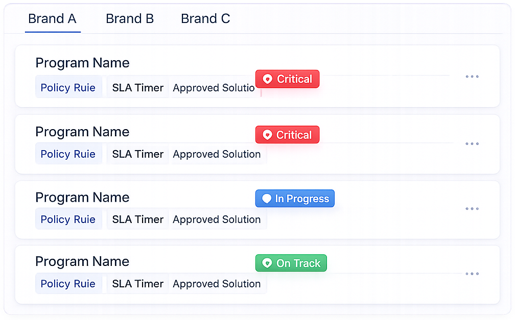 Manage multiple Service Programs across different brands. Separate rules. Shared workspace. Centralised visibility. Scale without fragmentation.
